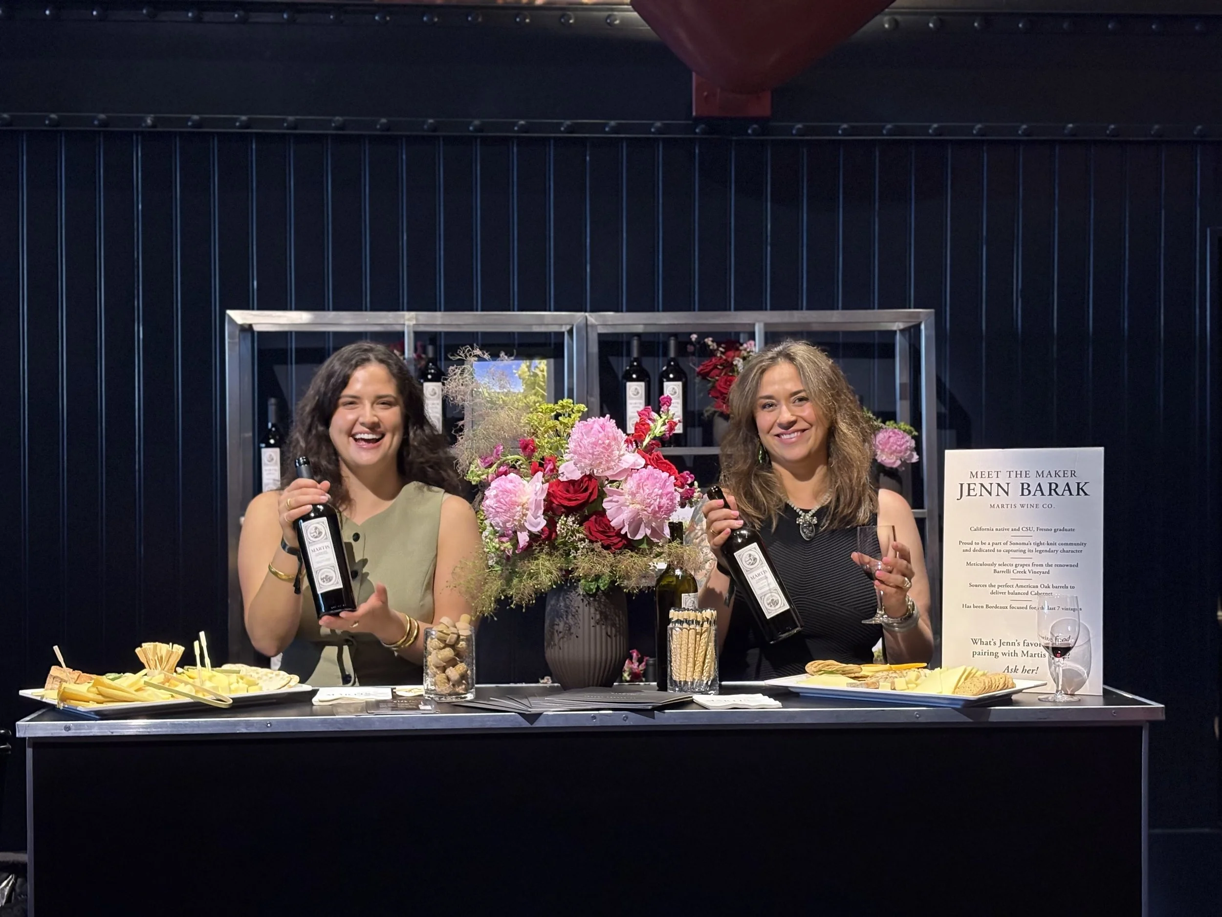 Two women standing behind a table with wine bottles, cheese, and flowers, smiling and holding wine bottles, at a promotional event for Jenn Barak of Martis Wine Co.