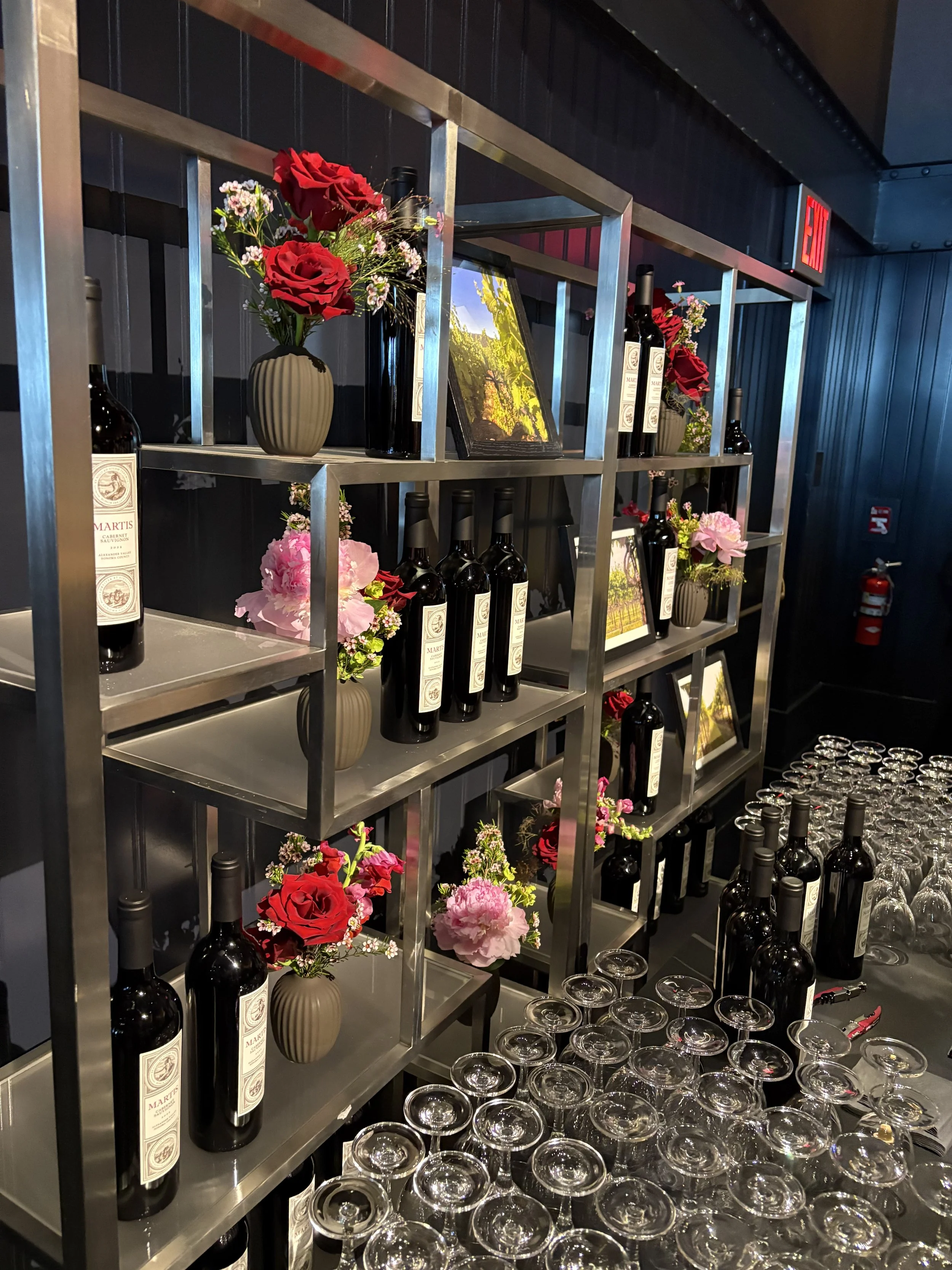 Shelving unit decorated with wine bottles, vases with red and pink flowers, framed photos, and empty wine glasses at an event.