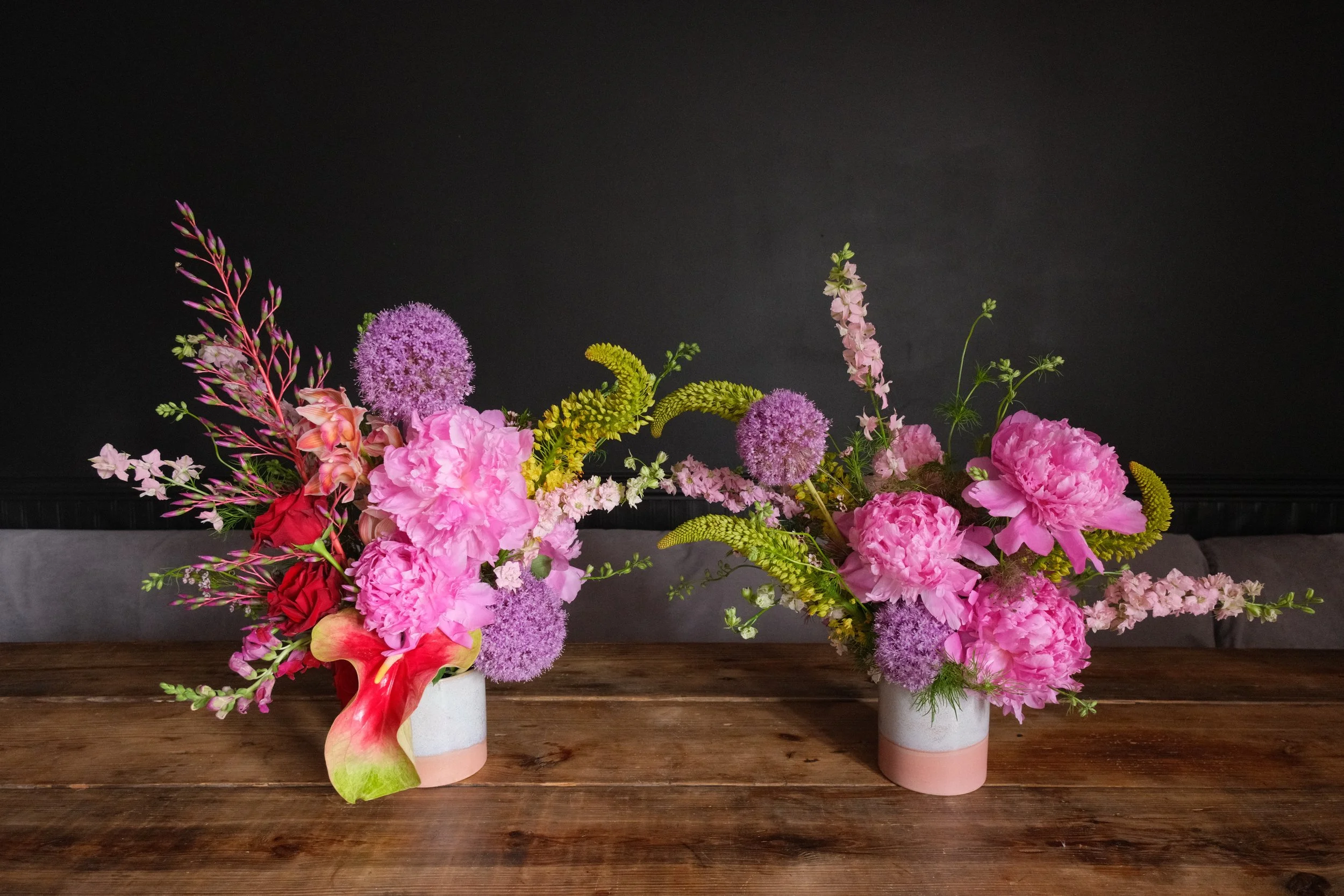 Colorful floral arrangement in a pink vase with roses, peonies, calla lily, and other flowers on a gray surface.